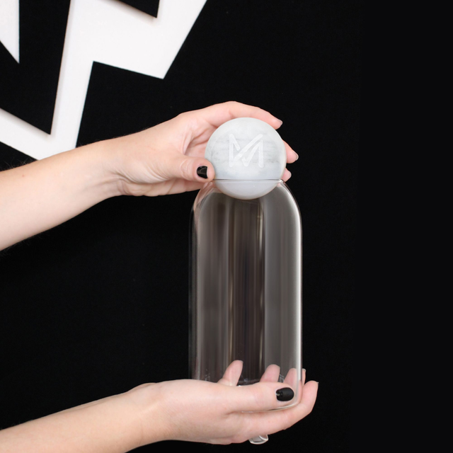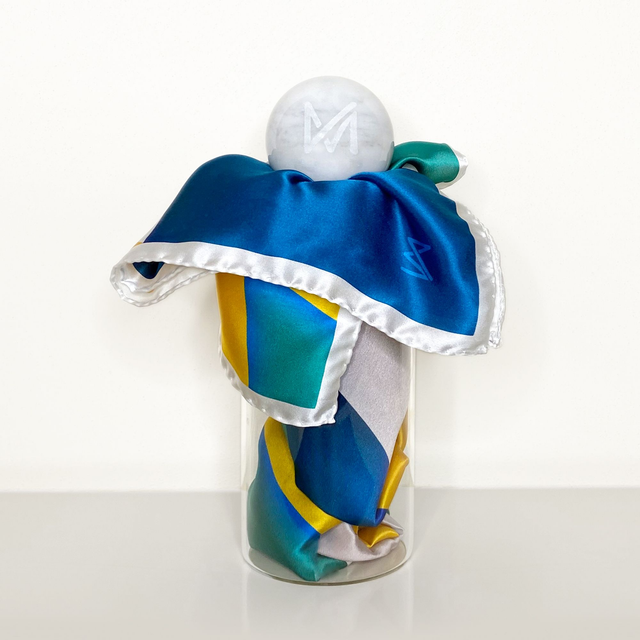 Foulard in seta con sfera in marmo e contenitore in vetro.