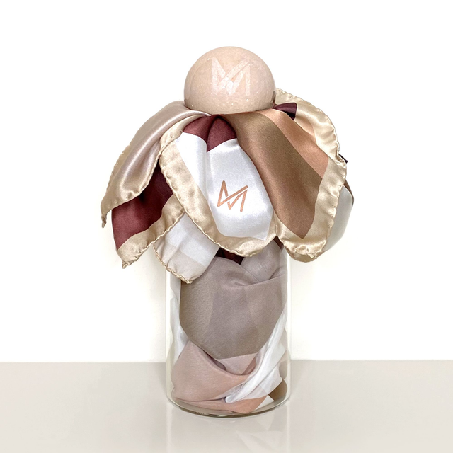 Foulard in seta con sfera in marmo e contenitore in vetro.