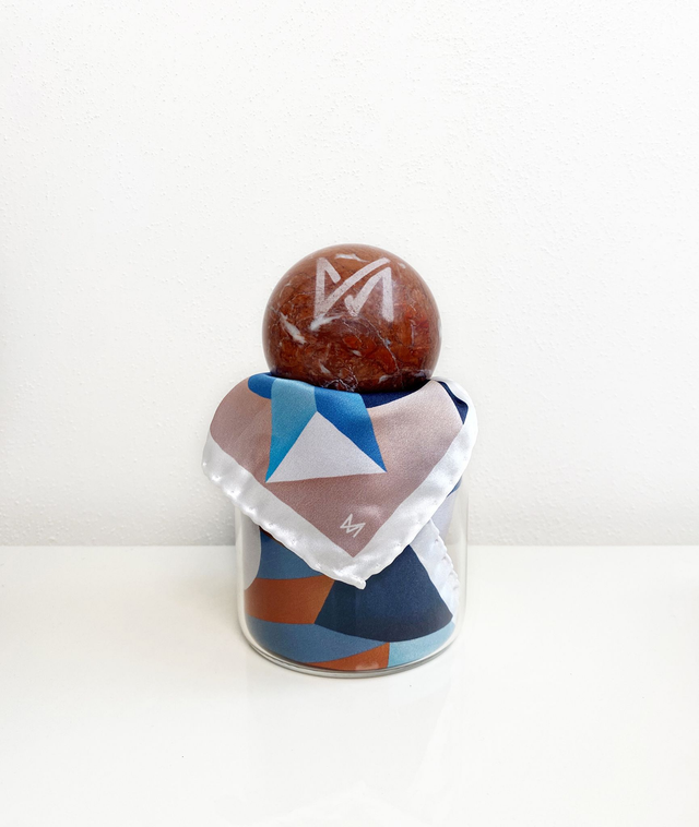 Fazzoletto da taschino/pochette in seta con sfera in marmo e contenitore in vetro.