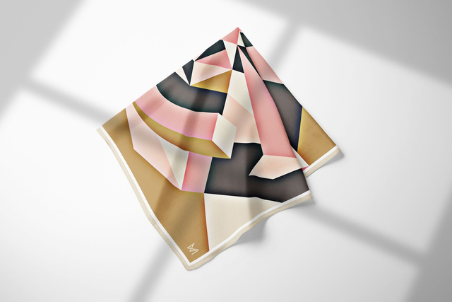 Le romantiche tonalità del beige e del rosa, combinate con accenti di nero e bronzo, compongono l'elegante palette di questo pregiato foulard in seta di Como. Parte di una serie limitata a 100 pezzi, comprensiva di certificato di autenticità numerato, ricrea l'opera d'arte "SPECCHIO" di Marzia Boaglio, concepita come un gioco di riflessi e frammenti che sembrano svelare mondi sconosciuti.