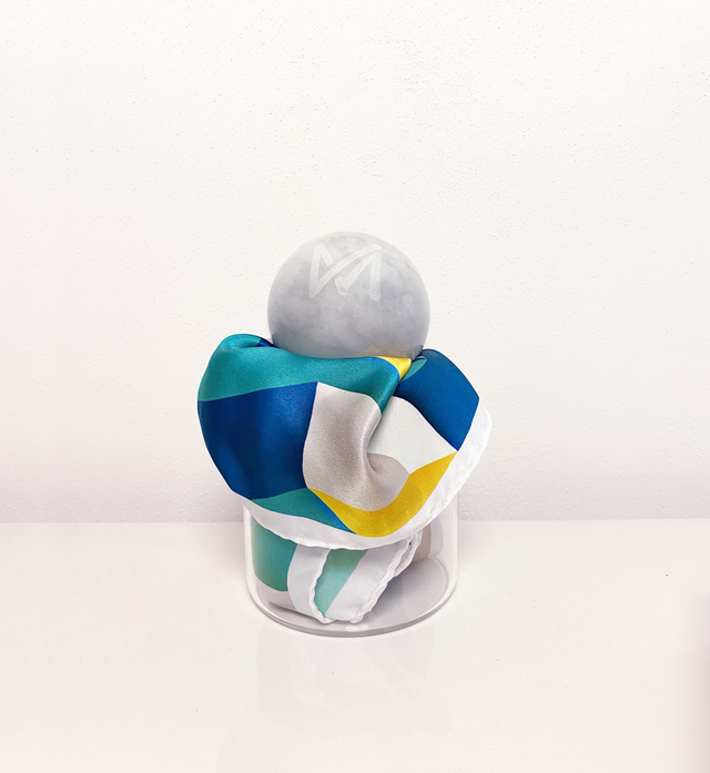 Un coloratissimo fazzoletto da taschino in pregiata seta di Como è accolto all'interno di un vaso di vetro trasparente e sormontato da una superba sfera di marmo bianca.